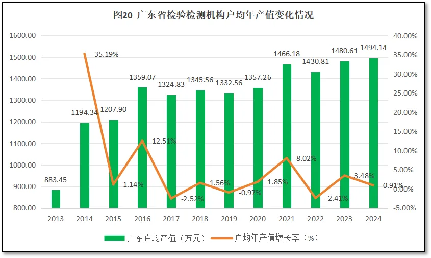 由图13可见,广东省检验检测机构户均对应的企业法人单位数量一直比全国平均水平高,这一方面说明广东地区制造业发达、企业数量众多,对检验检测行业来说市场空间大,还有不少发展机会;另一方面也说明广东省检验检测体系发展质量较好,规模与区域经济的适配程度仍保持在较好的水平。