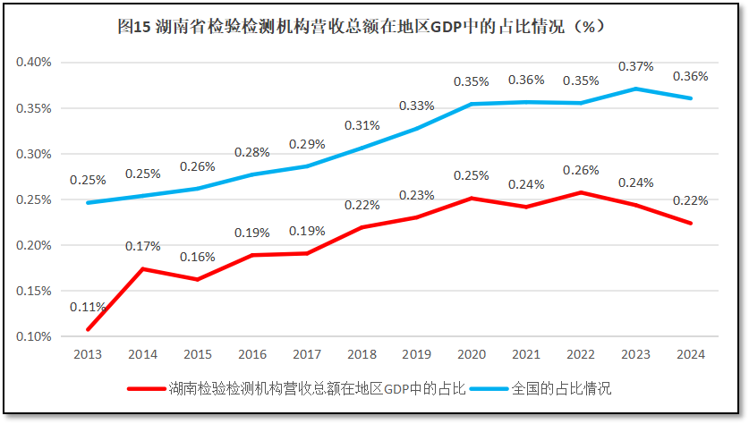 再来看湖南省检验检测机构营收总额在其地区生产总值GDP中的占比情况。2024年度,湖南省检验检测机构营收总额118.96亿元,占当年湖南省GDP值的0.22%,比全国平均值0.36%低了0.14%,排名全国第28位(由高到低排序),排名较2023年度下降了4位,已经处于全国垫底水平,这也是湖南省多项指标中排名相对靠后的一项。过去12年湖南省检验检测机构营收总额在当地GDP值的比例变化情况,如图15所示。